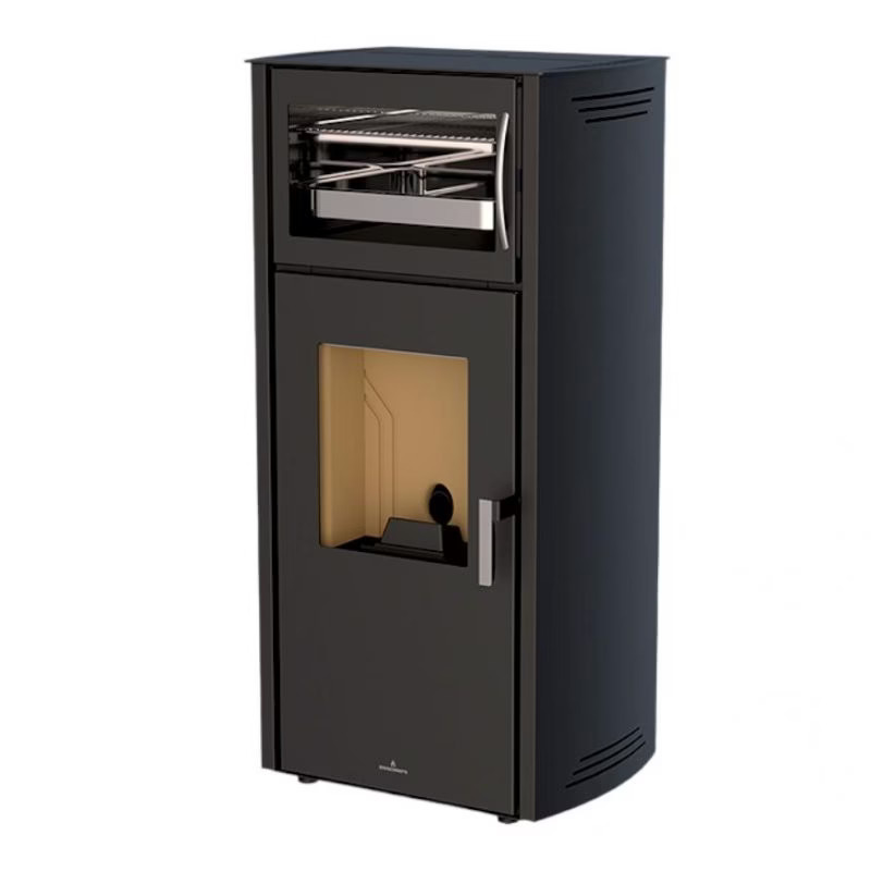 Stufa a pellet BRONPI Noa Horno 11 kW con forno da 52 L, ventilazione disattivabile per un funzionamento silenzioso e capacità di riscaldare fino a 250 m³. Ideale per cucinare e riscaldare in modo efficiente.