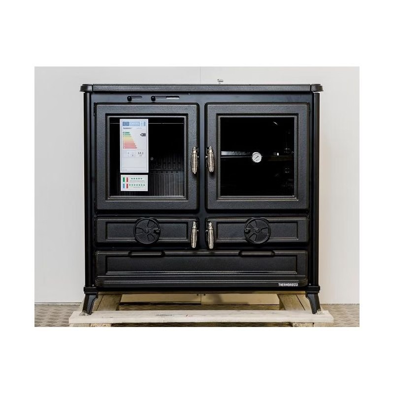 Il fogão a legna THERMOROSSI Klara Evo 12,1 kW unisce riscaldamento efficiente e cucina tradizionale. Con forno da 43 L e piastra con anelli in ferro battuto, è ideale per riscaldare ambienti fino a 109 m², permettendo di cucinare con il gusto autentico del legno. Robusto e funzionale, combina estetica classica e prestazioni moderne.